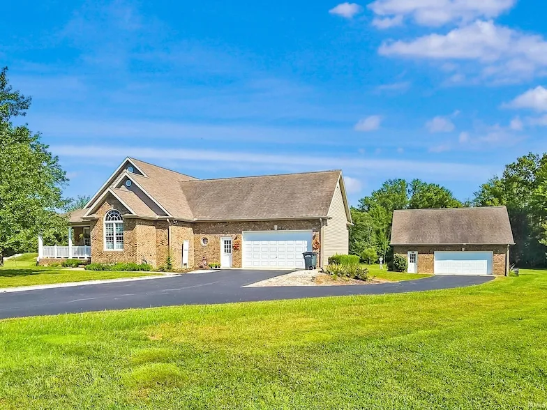 Nestled at the end of a quiet cul-de-sac, this custom-built 2006 home combines timeless charm with modern comfort. Sitting on 2 scenic acres, the property offers space and plenty of amenities for both relaxation and entertaining. Step inside to a bright living room with a vaulted-ceiling. The dining room is accented by stained glass windows and is bathed in natural light. The spacious kitchen features abundant cabinetry, a large island with seating, and a cozy eat-in area filled with natural light. The primary suite boasts a tray ceiling, dual closets, and a bath with a separate walk-in shower and soaking tub. A second full bath offers a double vanity and walk-in shower for added convenience. The finished walk-out basement provides exceptional versatility-complete with a full bathroom, this expansive space could serve as a family room, game area, or be divided into additional rooms to suit your needs. Outdoor living is equally impressive. Relax on the expansive wrap-around front porch, the shaded north-facing porch, or the large lower-level patio featuring a fold-out awning. The backyard gazebo with removable screens, garden shed, and multiple flower beds create the perfect setting for outdoor enjoyment. The two garages-an attached 2-car and a detached 2-car-are perfect for all your vehicles, tools, or workshop needs. With 3 bedrooms, 3.5 bathrooms, multiple living areas, and stunning views from every angle, this property offers the best of country living just minutes from town.