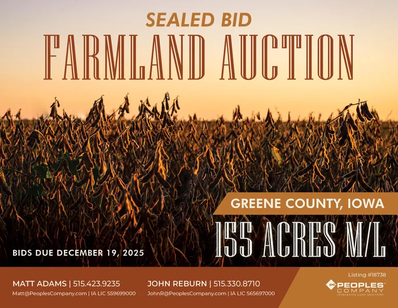 High-Quality Farm in Strong Farming Neighborhood Offered for Sale through the Sealed Bid Auction Method Peoples Company is proud to present 155 acres m/l of Greene County, Iowa farmland located north of Jefferson, Iowa. The farmland will be offered through a Sealed Bid Auction with all bids for the property due before 1:00 PM (CST) on Friday, December 19th, 2025. Bidders will have a single opportunity to bid on this farmland, and a live auction will not follow the Sealed Bid Auction. Please contact the Listing Agent for a copy of the form to submit your bid.