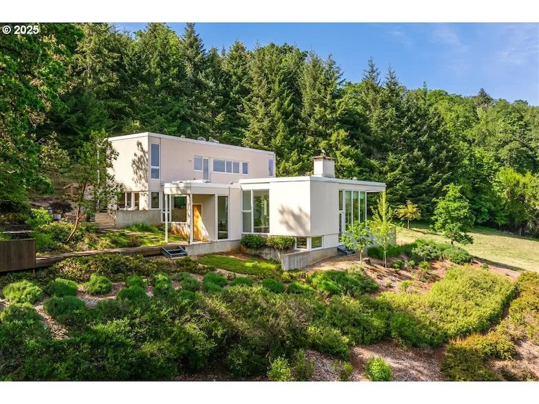 Located in the heart of Oregon's award winning wine country sits an exceptional 55-acre estate. 3 Bedrooms plus 2 offices makes the 5 bedrooms. The offices could easily be converted to bedrooms, a home gym, TV room etc. Option for a primary suite on the main or upper level. Additionally on the property is a 1152 sq ft workshop w/ bathroom. Designed by award-winning Portland architect Rick Potestio, this contemporary home is one of a kind. When you approach the residence, you are greeted by a 300-year-old oak tree perfectly positioned between the home and garage. Floor-to-ceiling windows w/ breathtaking Mt Hood views, 9-13 ft. ceilings, heated concrete floors, and an interior courtyard are a few of the design features. Beautiful custom rift cut red oak cabinetry and built-ins throughout. Large kitchen features Moroccan marble countertops, central island, gas range, pantry, plenty of stora...