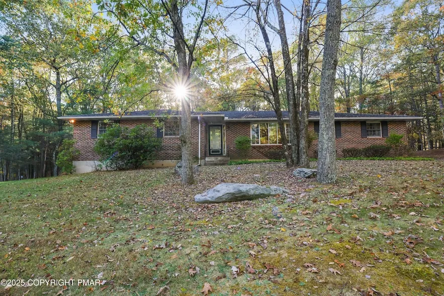 Do Not Miss This Solidly Built Brick Ranch in Pleasant Valley School District. Set just minutes from Route 715, this home offers both peaceful surroundings and easy access to major roads, making everyday living simple and convenient. Inside, you'll find a comfortable single-level layout with three spacious bedrooms and two full baths. The large living room features a picture window and cozy wood-burning fireplace, while the adjoining dining area opens to a rear deck overlooking the yard, perfect for relaxing or entertaining. The kitchen provides plenty of cabinet and counter space, ready for your modern touches or redesign. The primary bedroom includes its own en-suite bath and walk-in closet, while two additional bedrooms and a hall bath complete the main level. A large attached two-car garage offers excellent storage, and the full unfinished basement provides endless potential for future living space, workshop, or recreation area. Outside, enjoy the natural beauty of the Poconos and a private backyard surrounded by mature trees. Ideally located near skiing, wineries, shopping, and great local restaurants, this home combines classic comfort with incredible potential in a prime Saylorsburg location. A rare find in today's market - call today to schedule your private tour!