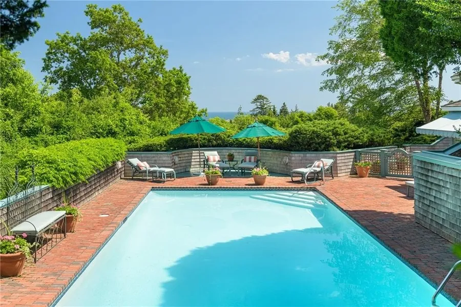 “Twin Ledges” located on historic Ocean Drive, is a charming seaside home offering privacy and seclusion overlooking beautifully landscaped grounds with sprawling lawns and the ocean beyond. This shingled-style residence, custom built in 1982, is set on almost four acres with an interior boasting four levels of finished living space, designed to maximize natural light and scenic views. The spacious living/dining area has an open and airy feel with high ceilings and large windows, leading to a captivating, enclosed porch, perfect for entertaining. The primary en-suite ensures coziness with a wood burning fireplace, plus two additional bedrooms in the main house. A finished lower level with steam shower offers access to the heated saltwater pool, while the two-car garage features an elegant one-bedroom in-law suite above connected by a porte-cochere.
