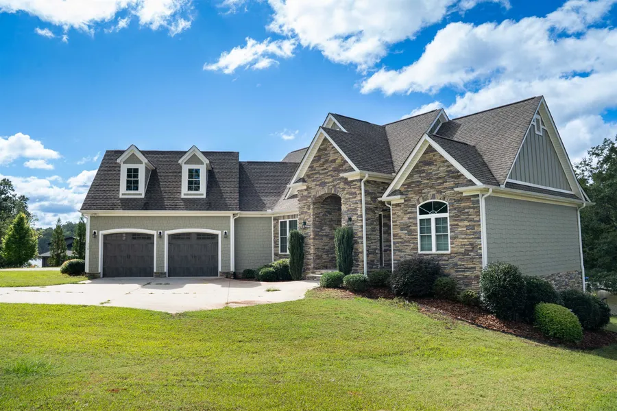 This waterfront home is special. Newer style home with formal entry way. Hardwood floors with a floor to ceiling fireplace. Overlooks the lake from not one but two porches that are screened in with fans. The main level of this home features a large primary with trey ceilings and has his and her walk-in closets. A primary bath oasis with glass, walk-in showers, soaking tub, double vanity is an absolute stunning retreat in your very own home. Spectacular open kitchen with high-end appliances and marble countertops with glass backsplash what an amazing chef‘s kitchen. Office at the front of the house with its own full bathroom. Down the hall you will find a walk-in pantry complete with shelves for food storage. Also on the same hall, you will find a laundry room with a sink and extra cabinetry. Home features a double garage. Kitchen has a breakfast nook that leads to the porch for your morning coffee. The den opens with all the windows to a screen porch overlooking the lake and sunsets. Such a grand home. On the lower floor, you have two bedrooms, bath, and a den. Walk out basement to the lake with a dock in place. Storage and utility room in basement behind the finished den where the mechanical room is located. Plus you get your own separate garage with two bay doors, one being oversize for a camper. That garage also has a half bath for convenience. Call today for your private tour of this lake front home.
