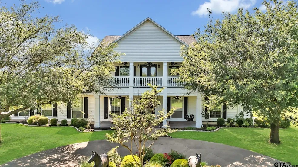 Awake to the golden hues of sunrise painting the majestic Barnwell Mountain range! Just a scenic 35-minute drive from Longview, this custom-built home is a true original, thoughtfully designed as a near-perfect homage to the iconic Southfork Ranch. Step inside and be captivated by the attention to detail: extensive crown molding, gleaming hardwood floors, and elegant plantation shutters throughout. Ten-foot ceilings amplify the sense of space and light in the open floor plan, where natural light floods every corner. Convenience meets comfort with two bedrooms and a fully remodeled full bath on the main level, now featuring a convenient walk-in shower (recently updated), along with a dedicated office and a well-placed half bath for guests and pool access. For added peace of mind, this remarkable home includes a hidden safe room discreetly located downstairs. Ascend to the upper level where you'll find a comfortable secondary bedroom and the expansive master suite. This private retreat features a dramatic vaulted ceiling, a generous walk-in closet, and a private balcony to soak in the views. The master bath is a sanctuary with his and her vanities, a relaxing soaking tub, and a separate shower. Outdoor living is paramount with an enormous 1800 sq. ft. covered back porch, ideal for entertaining while overlooking the sparkling gunite pool with a soothing waterfall. Practical amenities include a substantial insulated shop with skylights and two roll-up doors, a concrete drive with security gate, and a reliable well for outside watering and livestock. Nature enthusiasts will appreciate the large, stocked pond with its own deck, and the entire acreage is securely fenced with durable pipe fencing and hog wire. Horse lovers will find the two-stall stable with a tack room a welcome addition. This is more than a home; it's a lifestyle a unique property offering breathtaking views, the delicate beauty of drift roses blooming around your private pool, and enhanced security.
