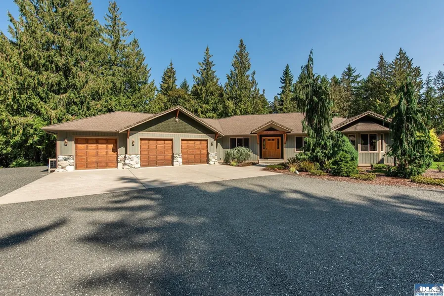 Embrace luxurious Northwest living on 10 tranquil acres in the heart of nature. A private driveway winds through mature evergreens leading to a sundrenched clearing showcasing this elegant 2005 custom home. With quality details galore, this timeless beauty offers 2,378 square feet (SF) of single-level living space with 3 Bedrooms plus a Den, and 2.5 Baths. There is plenty of room for your hobbies and toys with an oversized 1182 SF 3-car attached garage with a spacious workshop area. The open-concept design features a grand Great Room with a soaring vaulted ceiling accented by exposed beams centered around an impressive propane fireplace with stone surround; Dining area with built-ins; seamless indoor/outdoor living with a 540 SF Patio; and at the heart, the Gathering Kitchen, with granite counters, generous island seating, high-end appliances, and walk-in Pantry. Impeccable details at every turn: solid core doors and trim, generous use of slab granite throughout, hardwood flooring, built-in cabinets and speakers, central vacuum, full RV hook-up, trails, and the list goes on - SEE LIST. Meticulously maintained and it shows! Situated privately in coveted Black Hawk Ridge just southeast of Port Angeles. Loads of wildlife and plenty of recreation nearby with State lands. Approximately 3 miles to shopping & dining. Please see the video for an overview of this gorgeous property:
