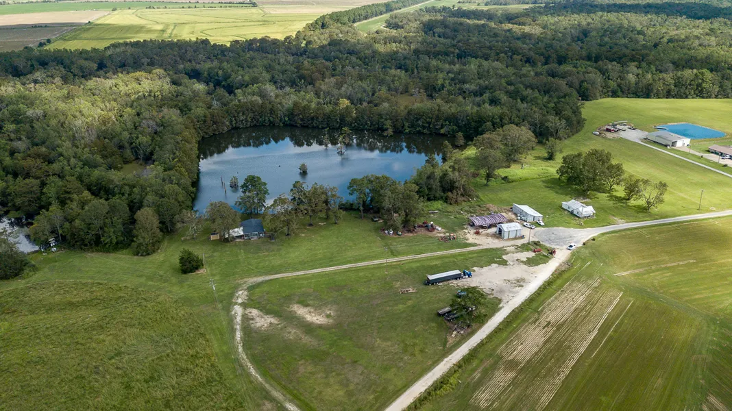 Approximately 737 acres of land on ridge that can be enjoyed for hunting (land borders Bayou Plaquemine), fishing in the 12 acre pond, approximately 1200 sq ft camp, barn, storage shed--quiet area to entertain so not to disturb neighbors; has an air strip for out-of-town guests/owners as well as a private access road.