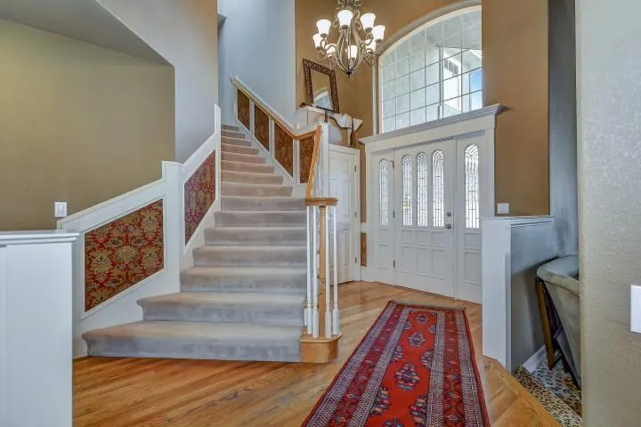 This beautiful 4 bedroom, 3 bathroom home is nestled at the base of the Boise Foothills, backing to BLM land, providing unobstructed views of the natural landscape. Home features a large gourmet kitchen with a 5-burner gas cooktop, built in double ovens and hardwood floors. The living room has a gas fireplace, vaulted ceilings and custom plantation shutters. Also has a custom oak built-in entertainment center with cabinets, bookcases and drawers on either side of the gas fireplace. A sliding door from the large informal dining room leads to the huge brick patio and back yard. 1 bedroom is on the main floor and 2 smaller bedrooms and master suite are on the second floor. Double doors open to the spacious master suite with crown moulding and a coffered ceiling. The master bath includes a double vanity, jetted soaker tub and a large shower. PRICE REDUCED from $610,000 Now only $538,900!!!