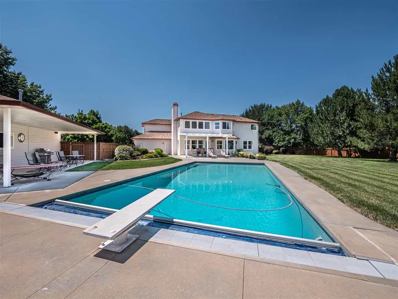 Beautiful 1.52 acre private & peaceful corner lot w/mature trees. Traditional floor plan & quality 2 x 6 const. Main floor office or 5th bdrm, living/dining room w/great windows for lots of light. Great room w/soaring ceilings & fireplace. Stainless kitchen appliances w/upgraded granite countertops. Amazing views of the backyard that includes a pool w/safety cover & tennis ct., 2 patios, pool house w/full bath & plumbed for a kitchen. Room for RV parking, Irrig included in HOA dues.