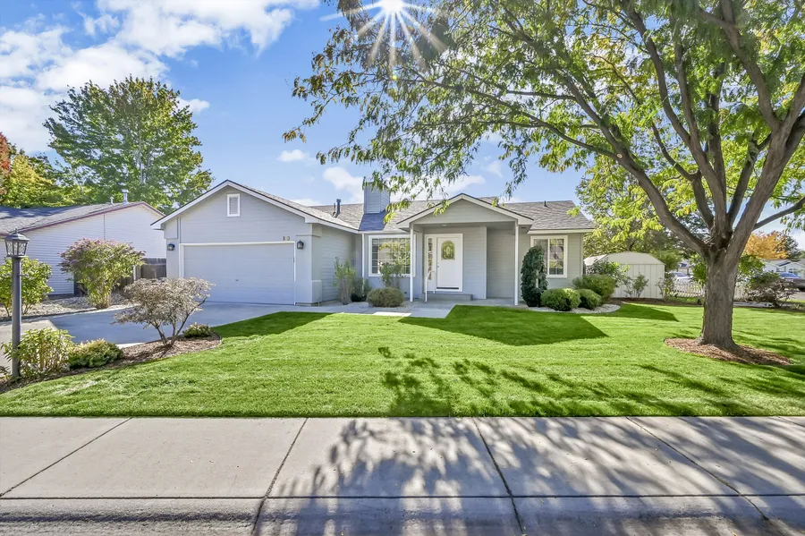 Introducing a sparkling, downtown Eagle gem! Tucked within an expansive 9,000 square foot corner lot, the location is walking distance to the post office, library, and multiple restaurants! Maintained with integrity, updates include a new HVAC in 2021, newer roof (less than 10 yrs), gleaming hardwood floors, and a remodeled kitchen with custom stylish cabinetry and quartz surfaces. The single level design features a sunshine-bright vaulted great room with abundant windows, an elegant fireplace, a window seat, and decorative plant shelves. The master suite has direct patio access and vaulted ceilings, and is served by a full bath with skylight, dual vanities, a shower, and walk-in closet. The south facing covered patio is set amid lushly planted flower beds, white picket fences, a garden space plus a garden shed, and mature landscaping. Low cost irrigation water is provided through the HO...