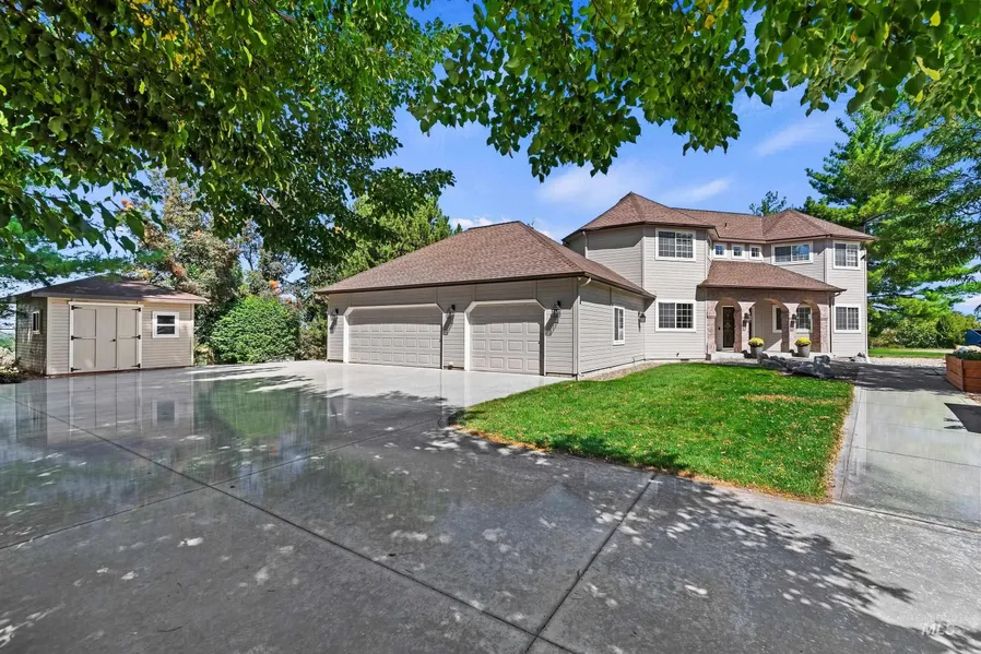 Custom home on 1.3 acres with valley-wide panoramic views! This home affords a variety of living/working situations as it has a main level apartment with a separate entry & 2 offices- think Multi-Generational, 2nd Primary Suite, Nanny, Guests, Rental & Working Remotely. The basement office/man cave also has a separate entry. Enjoy abundant natural light & views from almost every room. The kitchen & dining areas are perfect for entertaining as they flow seamlessly to the extensive deck & backyard for enjoyable outdoor living. Primary Suite on the second story boasts a large walk-in closet, jetted tub & separate shower. Expansive walk-out daylight basement provides lots of space for recreational & entertainment options. 2 Furnaces, 2 Hot Water Heaters, Private Well & Septic, no back neighbors & no HOA! Conveniently located near the new District (mixed-use project with retail, residential, entertainment & office); and Scheels in Meridian with easy freeway access. Good Feng Shui = Prosperity and Good Energy Flow!
