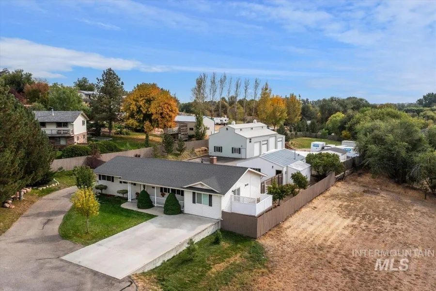 Discover a beautiful one-acre property in Southwest Boise, featuring a charming home, shop, and outbuildings—plus no HOA or CC&Rs! Enjoy a serene front yard with auto sprinklers, ideal for relaxing. Benefit from mature peach and walnut trees, along with irrigation water for your dream garden. Inside the 4-bedroom, 2.5-bath single level house, you'll find numerous upgrades completed in the last three years, including new appliances, water heater, high-efficiency HVAC, paint, and flooring. This property truly offers the best of country living! The insulated 3-car detached garage is equipped with plumbing for a compressor, wall AC, and a new epoxy floor. The versatile 4-bay shop is 1946 sf. and is perfect for a home business or rental income. It is complete with office space and a full living area that includes a kitchenette, bathroom, living room, bedroom, spare room, and storage.