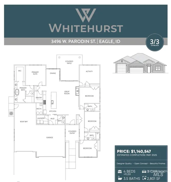 5/6/25 Completion! New ZEC home in Whitehurst Neighborhood. Single-level design with 4 bedrooms, flex room, 3.5 bathrooms, and a unique boat bay garage (12x12 door, 36 ft deep). Enjoy privacy with adjacency to a park strip and mountain views from your patio. Features include: vaulted ceilings, Thermador appliances, double ovens, refrigerator, guest suite with en suite, custom master closet, spacious showers with glass enclosures, a 48-inch gas fireplace, pre-wired for audio/visual solutions, 12 ft sliding door, BBQ gas stub, 220V garage outlet, an 18' wide garage door, insulation for sound, an enclosed mechanical room with multiple water heaters, motion-sensor lighting in the master bath, and complete fencing with landscaping.