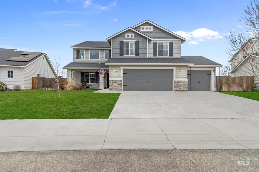 The first thing you will notice when you walk into this home is an abundance of natural light. Step through the front door into the living room with soaring ceilings, and a gas fireplace. Just beyond that is a large kitchen with pantry and island that opens up to a large great room perfect for entertaining with built-in bookshelves and drop down projector screen. There is one bedroom downstairs that would work as an office as well. Upstairs is a spacious master suite and 3 additional bedrooms. This home is in the heart of Kuna, close to shopping, schools, parks and the neighborhood has lots of walking paths.