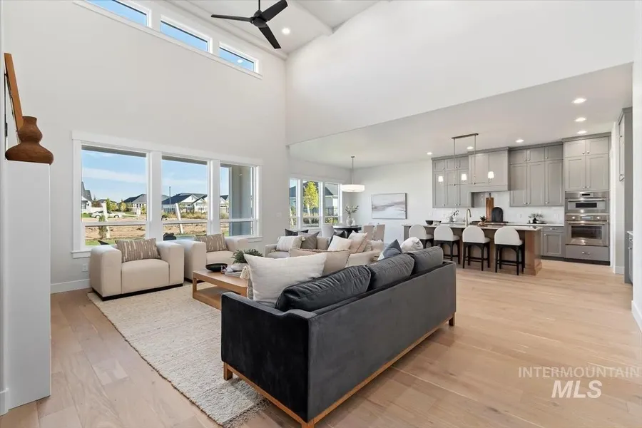 Welcome home to Tresidio Homes, Sherwood RV in the desirable Eagle community Stags Crossing! This stunning single-story home sits on a large lot with no back or side neighbors, offering privacy and space to enjoy Idaho living at its finest. With 2,808 sq ft of thoughtfully designed living, this home includes 4 spacious bedrooms, 4 full baths, a versatile bonus room, and a 4-car garage plus a full-size RV bay—perfect for all your toys and storage needs. The exterior features striking black windows and timeless curb appeal. Step inside to an impressive great room with soaring 16’ ceilings and rich stained beams that create a warm, inviting atmosphere. The gourmet kitchen is a showstopper with high-end KitchenAid appliances, beautiful quartz countertops, and a panel-ready built-in Thermador refrigerator for a seamless designer finish. The owner’s suite is a luxurious retreat with a spa-like bathroom featuring a stunning free-standing tub, full tile shower, and dual vanities. This is the perfect blend of elegance, comfort, and functionality in one of Eagle’s most desirable locations. Photos of Actual Home