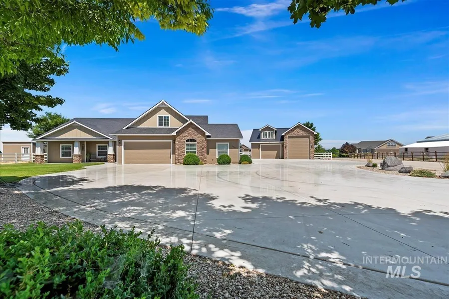 $50K Price decrease! Watch sunsets & enjoy panoramic views of the Boise & Owyhee Mtns in this S Kuna horse property. Relax by the firepit & cascading water feature, enjoy outdoor living & entertaining on lrg covered patio, Salt-Water Pool (heated/auto cover), lawn areas for games, garden area, fruit trees, or enjoy horseback riding in the 2-acre pasture. Lots of upgrades & attention to detail, this home has it all w/versatile living spaces for extended family, friends or multi-generational living. House main floor has 3 beds, 2.5 baths & all main living areas, upstairs has 2 beds, 1 bath, bonus rm, kitchenette & is designed for future outside staircase entrance. Plus, detached, heated 41'x15' RV Garage has add'l living space w/flex rm/loft for bdrm/office & full bath. Heated shop w/compressor 25 x20'. Gourmet kitchen has SS appliances, 5-burner gas range+built-in 2nd oven & micro. Lrg ma...