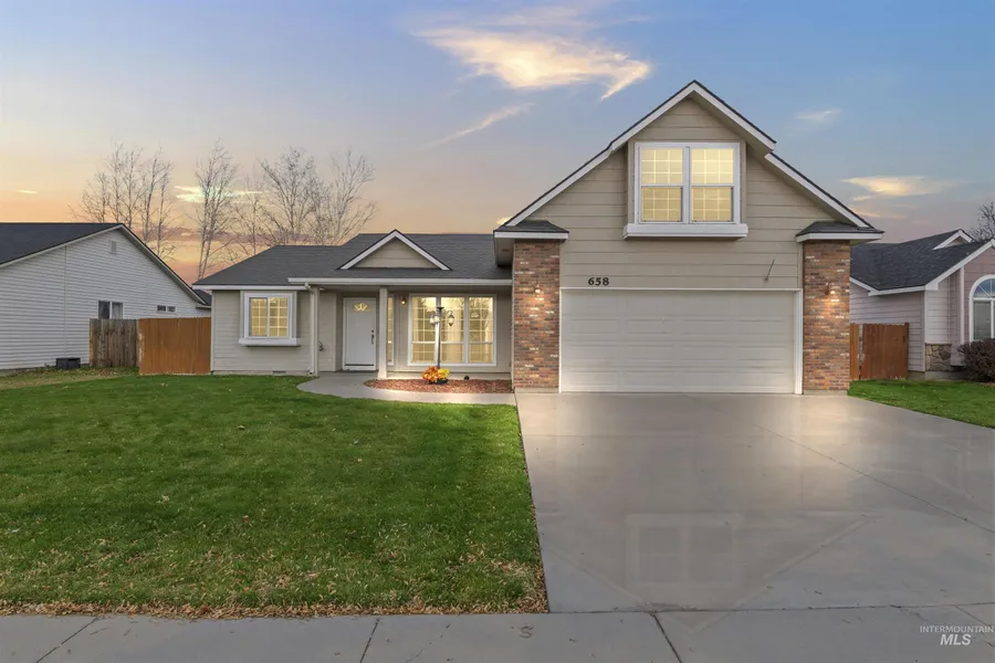 Quality construction defines this 3-bedroom, 2-bath, 1,556 sq ft home with a spacious bonus room, located in the established Wild Meadows neighborhood of custom homes. Set in a quiet yet convenient Kuna location, it offers close proximity to local amenities, a neighborhood park, and a dog park just a half mile away, along with easy access to Swan Falls, the Snake River, and Indian Creek. A covered front patio provides an inviting space to enjoy Kuna’s renowned sunsets, while the back patio is enhanced by a retractable awning for comfortable outdoor living. Inside, the split-bedroom floor plan offers privacy, while the vaulted great room is filled with natural light from large front windows and anchored by a striking corner gas fireplace. The kitchen and dining area feature a breakfast bar, large pantry, and upgraded appliances, creating a functional and welcoming space. Main living areas...