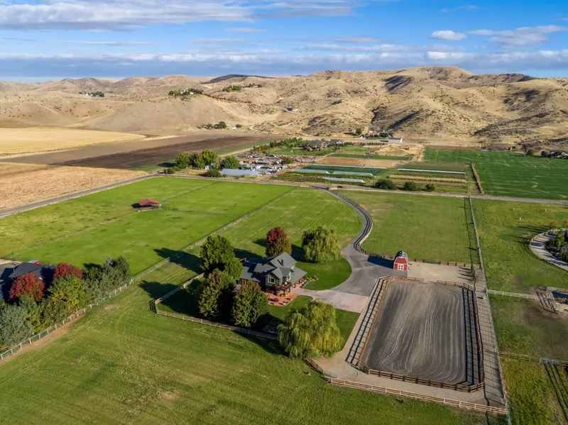 Beautiful 10-acre equestrian estate located on the edge of the foothills in North Boise. This property is ideal for horse enthusiasts and is set up for dressage training with a large riding arena, three separate fenced grazing pastures which are irrigated, and a huge barn style storage shed perfect for tack.