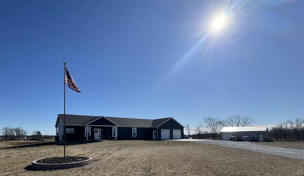 Stunning 5-bedroom, 3-bath ranch modular home offers the perfect blend of luxury and comfort on 6.1 acres m/l. Enjoy an open-concept living area that flows seamlessly into a master bedroom suite, featuring a walk-in pantry and a spacious walk-out basement equipped with a large family/game room. 4th and 5th bedrooms in basement are non-conforming. Dive into summer fun with your above-ground saltwater pool and unwind on the concrete patio overlooking a tranquil pond. With a 3-car attached garage and an additional shop with a one-car garage currently serving as a salon, this property is perfect for both relaxation and work. Don't miss out on this incredible opportunity!