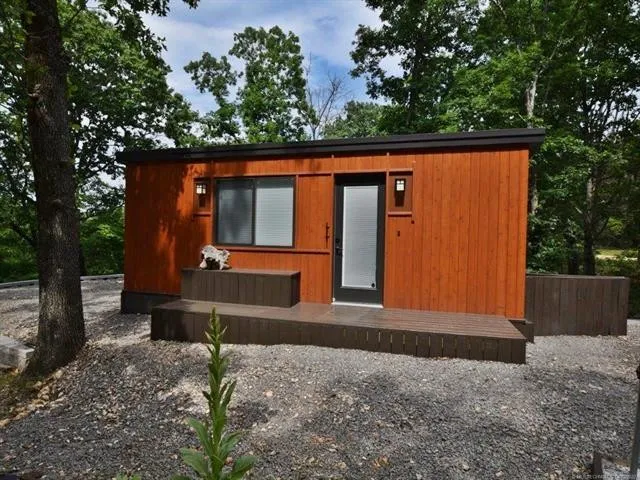 Are you ready for your get away destination? This newer tiny home with 187 sf (per owner) built in 2020, sits on 2.71 acres m/l with a natural spring on site. The home is connected to a septic system and rural water. Within 1 mile of the Illinois River Ranch. Concrete block retaining wall around the home, w/ built in fire pit on a large gravel patio at the rear of the home. Open floor plan, with a combined dining, living, kitchen, bedroom & private bath. Mini-split heating/cooling. Comes fully furnished. Cash or in house loan only.