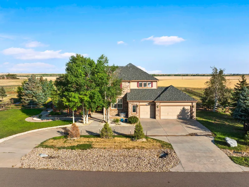 Experience the tranquility of country living with the convenience of a reasonable commute to Metro Denver. One of the premier corner lots in the community! This home shows very fresh, clean and filled with natural sunlight from the multitude of windows throughout. Move-in ready! Home professionally cleaned by commercial cleaners. All windows cleaned by commercial cleaners, BRAND NEW PAINT on all walls on main level and upper level, all the kitchen cabinets were professionally painted white, BRAND NEW CARPETING AND PADDING throughout. Removed dead trees in front and many trees were replaced in past year. Four NEW garden planter beds for planting vegetables and herbs, etc. Pruned all trees on property. Three NEW apple trees in back already bearing fruit. Five NEW evergreen trees in backyard. $16,000 BRAND NEW HVAC (furnace, a/c unit and 230 volt steam humidifier). 3 fireplaces. Outdoor built-in stainless steel large gas grill. Private outdoor deck off the Primary Suite. Hot tub included. Washer & Dryer included. Home theater with theater chairs that stay with the house. Irrigation system front and back. Incredible covered patio/terrace off the kitchen and family room runs the length of the house.