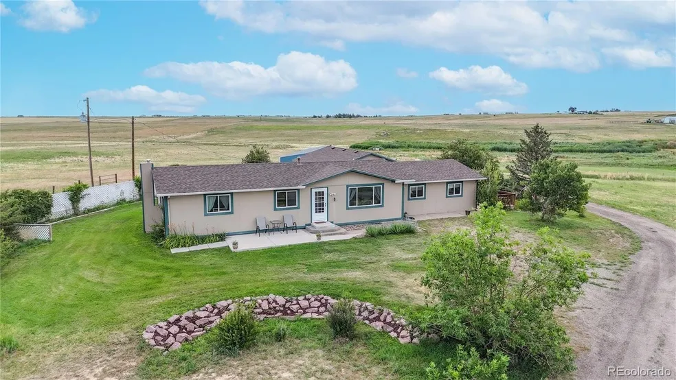 Nestled on a peaceful 10 Acre lot with sweeping prairie vistas, just a mile outside of town, this well-appointed home at 4160 Converse Rd offers a perfect blend of rural tranquility and modern convenience. The open-concept living area welcomes you with a large picture window framing Colorado's dramatic skies and beautiful mountain views, and durable laminate flooring that flows throughout the living room. The heart of the home features a spacious kitchen with a stainless steel refrigerator, tile countertops. The split-bedroom layout includes a private primary suite with a sitting area and a walk-in closet, en-suite bathroom featuring a large 6 foot bathtub and a step-in shower. 2 additional bedrooms share a full hall bathroom with a tub-shower combo and 4th bedroom has an en-suite with tub/shower combo. The partially finished basement expands your living space with a large family room with a wood stove and a versatile bonus room perfect for a home gym. Practical touches include a main-floor laundry room, central air conditioning, and abundant storage throughout. Outside, there is a side deck and generous back patio that offer ideal spaces to enjoy breathtaking sunsets and Colorado's fresh air, with plenty of yard space for outdoor activities. 3 car detached garage with plenty of storage area, and workshop with 3 car carport, chicken coop, lean-to for animals, and shooting range finish the outside accessories. Located just minutes from downtown Bennett's charming shops and restaurants, and quick commutes via E-470 to Denver or DIA. Outdoor enthusiasts will love the proximity to wildlife-rich open spaces, the historic High Plains Raceway, and nearby Barr Lake State Park for fishing and birdwatching. With its perfect balance of country living and modern amenities, this move-in-ready home offers an exceptional Colorado lifestyle just beyond the metro area's hustle and bustle.