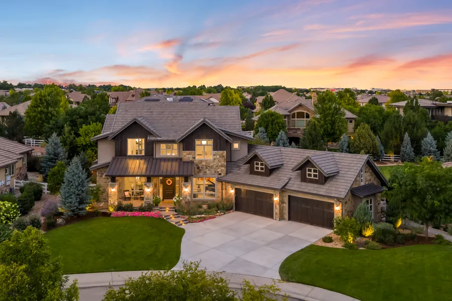 Step into this luxurious custom home with resort-style amenities and thoughtful upgrades throughout. The main floor features a living room with surround sound, custom built-ins, and fire ribbon fireplace, plus automatic shades on large sliding doors to the patio. The Chef’s kitchen offers Thermador appliances, 6-burner gas range with griddle, double ovens, microwave, dishwasher, walk-in pantry, and butler’s pantry with wine cooler, complemented by a kitchen nook and formal dining. Main level also includes a private office, mudroom with custom built-ins, laundry with utility sink, powder room, and guest suite with en-suite bath and French doors. Upstairs, the primary suite provides dual vanities, walk-in California Closets, automatic shades, and a spa-like en-suite bath. Additional bedrooms include two that share a Jack-and-Jill bath and one with its own en-suite, all featuring walk-in closets and custom drapery, plus flexible office spaces. The finished basement (Jan 2020) includes a climate-controlled and humidified wine vault, bar with ice maker and beverage refrigerators, living/game areas, exercise room or bedroom, bathroom, and Kentucky barn wood accents. Engineered hardwoods, gym flooring, and surround sound complete the space. Outdoor living impresses with professional landscaping, pergola, fire pit and fire ribbon, saline pool and spa with three waterfalls, custom pool covers (2), outdoor kitchen with Lynx grill, Big Green Egg, dual beverage refrigerators, TV, speakers, Restoration Hardware umbrella, seating for 32, and K9 turf area. Recent upgrades: new driveway (2025), upgraded carpet (2024), and custom window treatments/automated shades throughout. Additional features: fire suppression throughout home, Savant AV, outdoor Lutron lighting, upgraded Restoration Hardware lighting, smart front door, Nest thermostats, indoor/outdoor cameras with ADT, UV air purification, whole-home humidifiers, and epoxy garage flooring with cabinetry.
