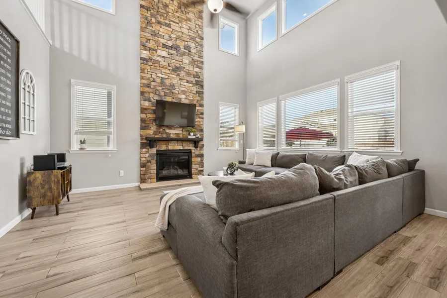 The main level features vaulted ceilings and an open, functional layout designed for entertaining and everyday living. An office at the front of the home doubles as a 5th non-conforming bedroom. At the heart of the home, the upgraded kitchen showcases granite countertops, stainless steel appliances, quality cabinetry, and generous counter space, all flowing seamlessly into the bri...