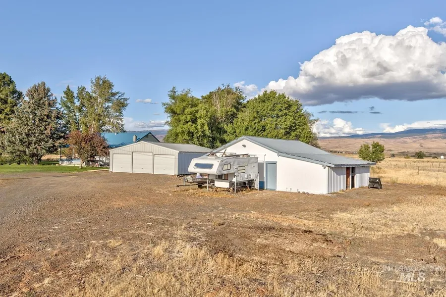 Welcome to the tranquility of country life, set amongst fields, beautiful panoramic views, & wildlife on this 20-acre mini ranch. The property includes a multi-gen open floor plan home, 3 bay garage w/extra storage area, & separate workshop. The covered front deck leads into the main level of the house, where you'll find an open & airy great room, kitchen, dining, & primary bedroom w/ensuite bathroom. Features include a cathedral tongue & groove wood ceiling, dual pane windows providing great natural light, LVP flooring, pellet stove & electric baseboard heaters for cozy winters, stainless steel down draft stove/oven & refrigerator, & wonderful views from every room. Walk out the back door to another spacious covered deck surrounded by a parklike yard w/numerous shade & fruit trees, & spectacular mountains in the backdrop. The lower level can be accessed from inside, or from a separate covered entrance. Kitchen, dining, 3 bedrooms (or office), family, bath & utility area.
