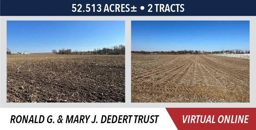The Dedert family farm is located at the north edge of Quincy, IL near the intersection of Hwy 96 & Hwy 24 (North 24th St.). The farm is further described as being located in Section 12, T1S - R9W, Riverside Township, Adams County, IL. Both tracts represent productive, tillable cropland and have excellent potential for development with an ideal location.