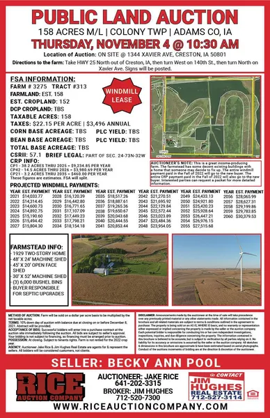 Research Parcel InformationTake Hwy 25 North out of Creston, IA, then turn West on 140th St., then turn North on Xavier Ave. Signs will be posted.