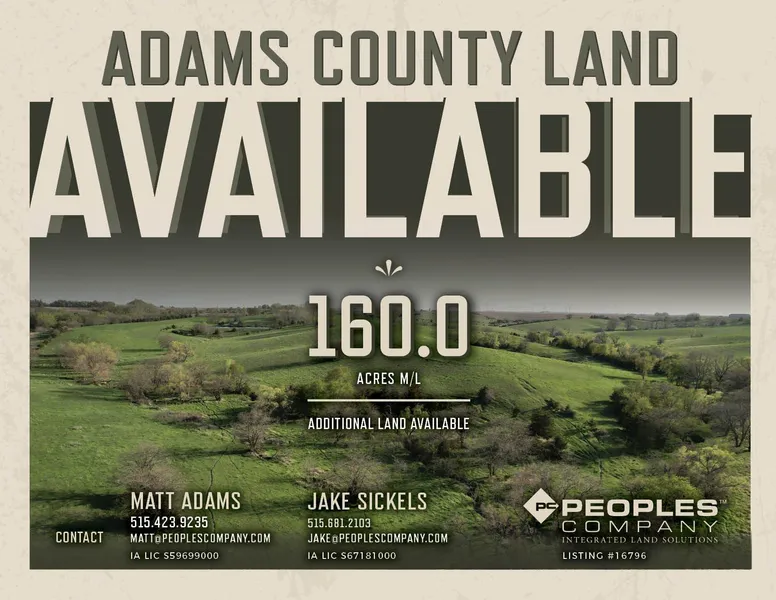 Peoples Company is pleased to offer a rare opportunity to purchase 536.6 acres m/l of Adams County combination farmland, offered in 4 tracts ranging from 66.6 to 200 acres m/l, located just west of Prescott, Iowa. These tracts include a wide variety of attributes and feature something desirable for any type of Buyer including but not limited to; well maintained and substantial income producing CRP acres, heavily timbered draws and cover, a lake, multiple ponds, tillable ground, and pasture. These farms are offered in four separate tracts but could be purchased as a turn-key unit as well, allowing a Buyer to acquire a large amount of acres in one specific area - a task that often takes decades of hard work and effort. All four of these farms have been meticulously maintained and kept up to a high standard by the current ownership.