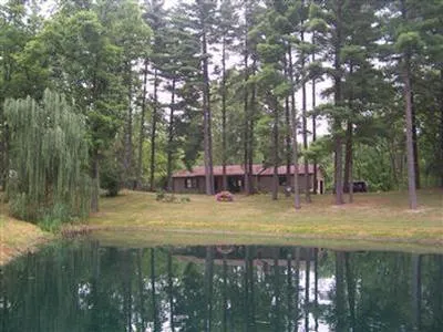 Large pine trees in front of home and 2 ponds in front +1 in rear. Covered front porch and rear deck. Large pole barn/shop. Acreage is mostly wooded. 9.5 acres secluded acreage. 4 bedrooms, 2.5 baths.