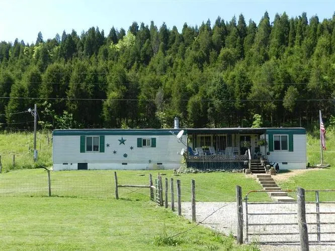 2 BR, 2 bath mobile home with addition. Large barn. Vinyl windows, plywood subfloor, block foundation with crawlspace. Newer furnace, new aeration system to be installed, small pond, woods, pasture. The barn includes 2 12x12 horse corrals, tack room, and a 2 story primitive living area with electric.