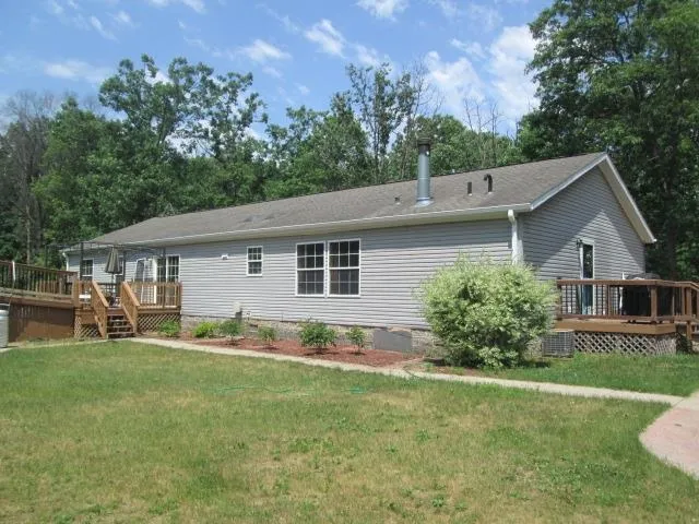 Spacious Manufactured Double Wide Ranch located just on the outskirts of the City of Adams. Features included appx. 2,400 sqft of living space with 4 BR's and 3 Baths. Huge open concept kitchen to living area with wood burning fireplace. Another separate living area open to the dining room. Additional bonus room or office and Walk out to nice deck and your 27 ft above ground pool! Detached 30x40 Garage with workshop and extra storage attached to back of garage. New seamless gutters on house and garage. Additional 30x30 Pole shed. All situated on secluded 5.68 acres set back off the road. Only 5 minutes to town. Just 30 miles north of Wisconsin Dells. Make this your new home today! All Offers to be presented at 5 P.M. 06/19/21