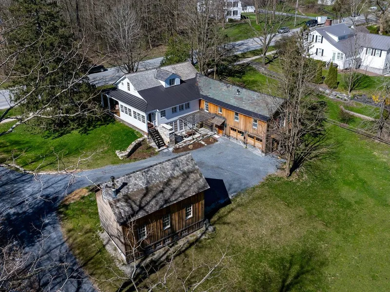 This historic and elegantly restored home on one acre with many mature trees includes an attached barn with extra living space, as well as a separate barn that has potential for multiple uses. Built in 1818 this property is included in A Walking History of Middlebury Vermont, and is only one block from Middlebury College. Outside, the house retains its classic appearance. Inside, the house has been rebuilt and restored from floor to ceiling with a tasteful nod to the past and a practical acceptance of modern convenience. Inside the front door is the foyer, with lovely wainscoting and natural wood staircase, which make a stunning first impression. To the left one enters the formal living room, and to the right is the primary bedroom suite with full bath. Beyond the living room are the dining room and a fabulous kitchen with a DeLonghi gas range flanked by soapstone countertops. A staircase leads from the porch off the kitchen to the backyard patio, complete with fireplace. Upstairs are two bedrooms and another full bath. Beyond the kitchen, the attached barn offers additional living quarters by adding a large family room, two bedrooms, a bathroom, and a small kitchen, all on the same level as the front of the house. A descending staircase provides access to the back entrance and mudroom, as well as the two-car garage and voluminous and completely dry basement.