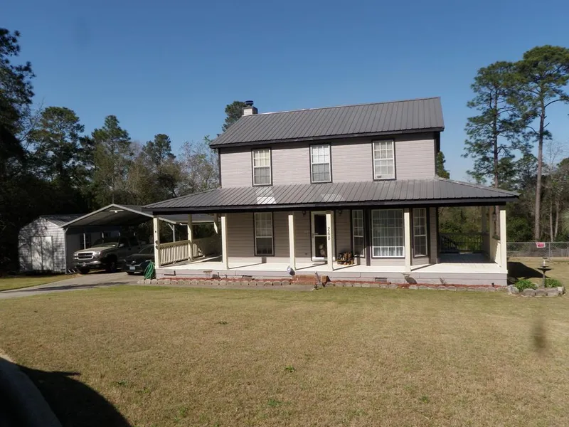 Pretty Two story home located in a quiet cul-de-sac with wrap around porch on 1.1 acres, 3 bedrooms, 2.5 bathrooms, Living Room with fireplace, wood steps going upstairs, sprinkler system in front yard, great 26 X 30 deck, tankless water heater, metal roof , storage building, double detached carport; bedrooms walls have been painted along with trim work and windows, hall trim painted, metal roof installed in 2012; small freezer in kitchen does not stay