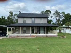 Farm house style two story home located in cul-de-sac and situated on 1.1 acres. Features include NEW architectural shingle roof installed 2022, 44 foot long front wrap around porch, 26 X 30 back deck,, tankless hot water heater, fenced back yard, front yard sprinkler system, double detached carport, storage building remains, tiled kitchen counter tops, 3 Bedrooms, 2.5 Baths, interior stairwell wood steps.