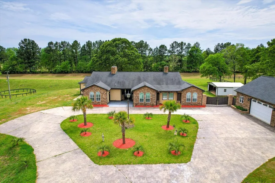 ***MOTIVATED SELLER*** Own your own piece of horse heaven in Aiken, SC! Come Home to the illustrious equine community of Aiken County, S. C. This stunning 3270 sq ft custom home with stone and wooden accents has 4 bedrooms, 3 and half baths, and an office. The open floor plan greets you as it opens to a large family room with wood-burning fireplace and stone accented built-in shelving, separated only by a granite-topped bar, with deep farm style sink, that spills into a full kitchen with cherry wood cabinets. A large eat-in dining area with a large handmade dining table sits off of the family room. All bathrooms have granite counter tops with tile accented walk-in showers. A large, fully accessible laundry room sits between the back bedrooms with room to comfortably maneuver. This spacious Ranch-style home, built in 2017, is all one level with views of the 20 plus acres of pasture land, landscaped entrance with palms and local vegetation, and a back covered patio. A 4-car custom built, 1200 sq ft garage has a full kitchen and half bath with climate control and finished drywall. Near the front of the property as you enter the main gate and through the tree-lined drive of what feels like a sprawling hacienda, is a large barn with 6 stalls on one side. The opposite side is open and currently being used for equipment, horse trailer and tractors. Equipped with a complete perimeter fence, including 5 separate paddocks within, roomy run-ins and a second barn sits at the rear of the property. A small additional building sits just behind the main house and can be used for gardening tools or storage. This farm is less than 12 miles from one of South Carolina's best towns to live in, Aiken, S. C., and less than 30 miles from Augusta National Golf Club. Surrounded by amenities and necessities for horse keeping and quiet, country living, this equine villa is ready for new owners.