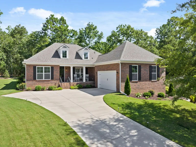 Rare opportunity to own a thoughtfully designed, 2-year-old custom brick home in a highly convenient location within Woodside Plantation. This meticulously maintained, one-level home sits on a hard-to-find .42-acre lot with wooded privacy in an established section of the community. The flexible split-bedroom layout includes 3 bedrooms, 2 full baths, and a dedicated office-ideal for a home office, hobby space, or quiet retreat. Enjoy elevated features throughout, including 9.5' ceilings, exposed beams, and a gas fireplace in the spacious great room. The chef's kitchen is equipped with Bosch stainless steel appliances, quartz countertops, a pot filler, vent hood, and a generous walk-in pantry. A formal dining room with a trey ceiling adds elegance and functionality. The private primary suite invites you to reboot and relax, offering a large walk-in closet, custom tile shower, and dual gran...