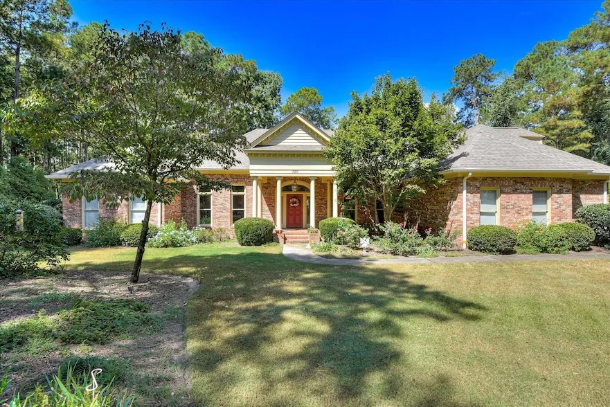 Sprawling & spacious Georgian-style ranch in Woodside Plantation's coveted Estate enclave, this 3-bedroom home is nestled in a park-like setting, surrounded by beautifully landscaped grounds and a stunning resort-like pool. A lofty entryway with custom coffered ceilings in the dining room and built-in bookshelves in the library/office. Bright and spacious living room with gas-log fireplace. Updated kitchen, new roof & HVAC system. Large storage/bonus room on second floor above the attached 2-car garage. Sunroom with heating & air. Custom fenced-in dog run area. Charming in every way.
