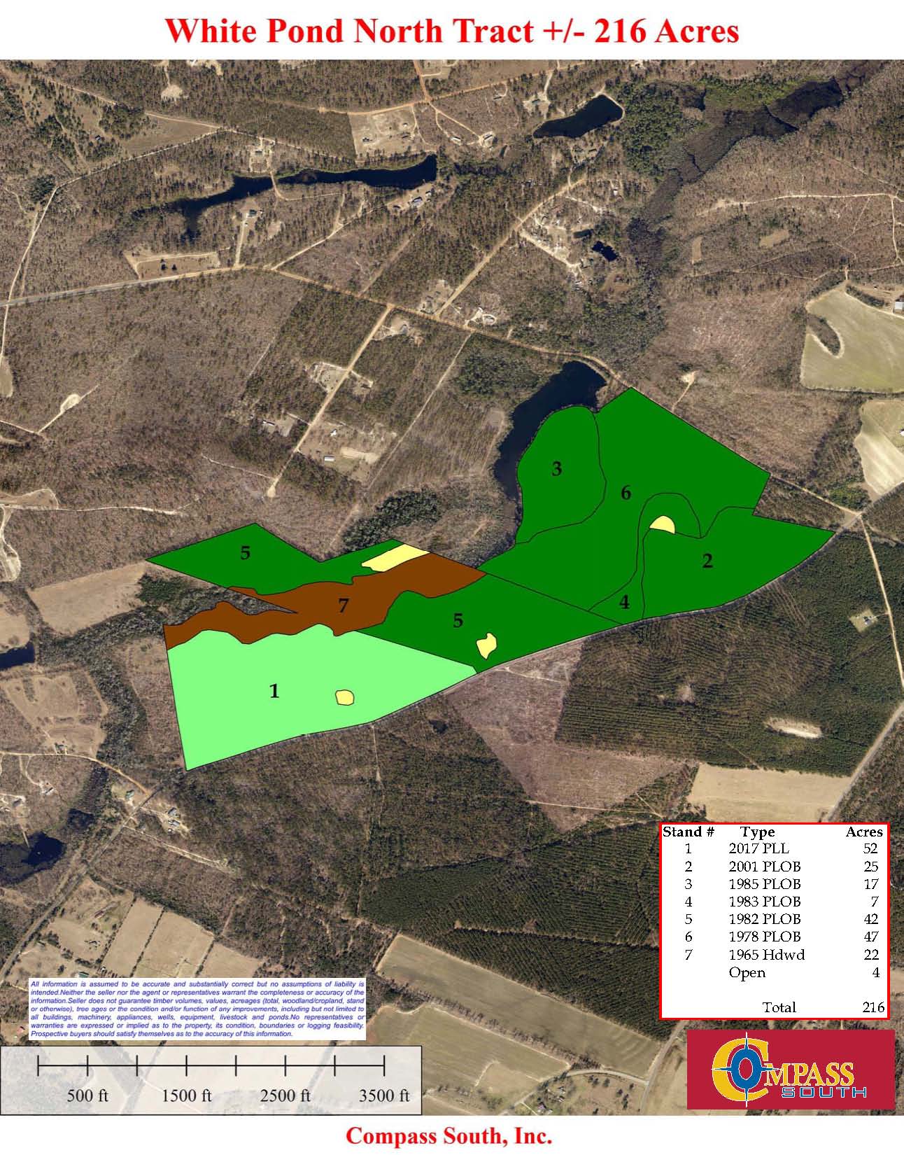 White Pond North Tract is located in Aiken County on White Pond Road. Of the 216 acres that total the tract, 52 acres are in planted longleaf pine, 138 acres are in planted loblolly pine, and 22 acres are in hardwood with the balance being open. Merchantable timber provides the opportunity for current income while the premerchantable timber has the opportunity to become near term income for the buyer. There nice hardwood branch that has a creek running through it. With the aforementioned features, White Pond North Tract is able to support a healthy wildlife population and is great hunting tract. Established ATV trails that are easily accessible are an added bonus.