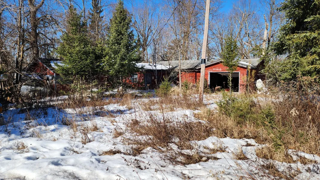 The house is dilapidated. All vehicles stay with the property. The property does go down to Gunn Lake and there is lake shore.