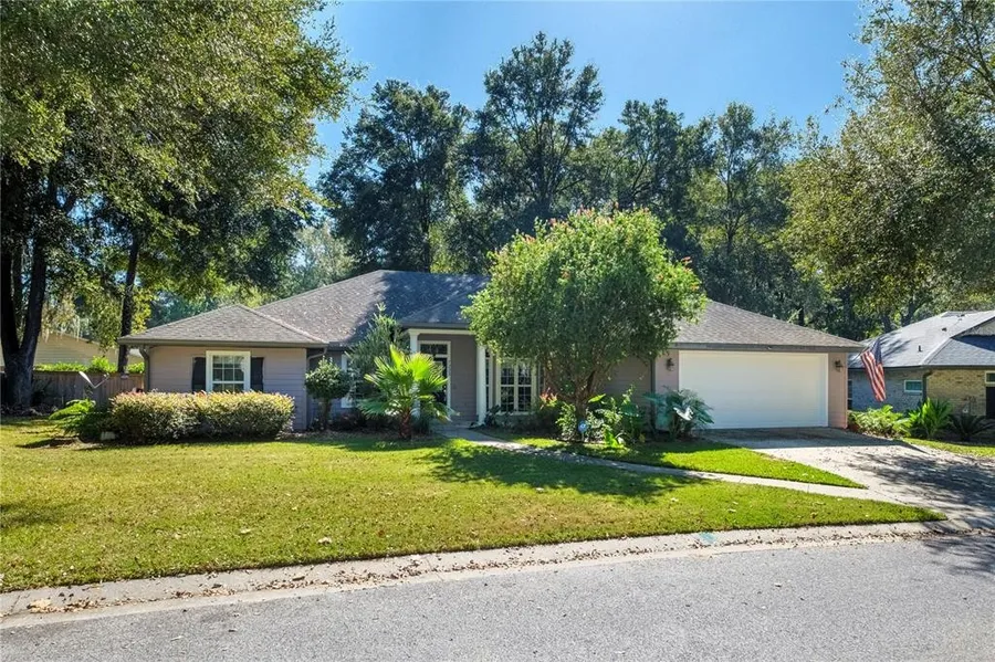 Beautifully modernized 4 bedroom/3 full bath/2 car garage home with an additional office space containing built-in bookshelves. The entire back of the house has an enclosed fully windowed lanai that is air conditioned and heated with the main house. The lanai also includes cabinets and counters. Large separate laundry room with a pocket door that is off the garage entry doorway. The primary suite includes a spacious walk-in closet, a large bathroom with a walk-in shower, a soaking tub, and dual sink vanities. The first guest bedroom is private and has its own full bathroom with a tub and shower. The other 2 bedrooms have a full bath between them. All guest bathrooms have skylights. The floorplan is an open concept with the main living area and a 3-way split. Abundant natural lighting from multiple windows encompasses the open floor plan. Renovated with updated lighting and fan fixtures. The kitchen has all stainless steel appliances (gas hook up for stove), marble kitchen countertops, and solid wood cabinets. The entire house is wood and tile flooring. Home is an alarm hook-up ready with shock alarm sensors on every window, fire alarm, and carbon monoxide monitored alert system. The capability of cellular access with ADT. RING doorbell and camera system installed. The roof and outside are cleaned and painted, and all gutters are new and clean. All landscaping has been retailored and diversified to include butterfly and hummingbird nests that return yearly. A full-yard timed sprinkler system was installed. New water softener system. There is a newly built 6- foot privacy fence around the backyard with gate access. The backyard patio is constructed of brick pavers surrounded by lavish flower beds and a built-in fire pit. Located in Turkey Creek Golf Course, a security guard gated community. This home also resides within the only small subdivision within the community, White Oaks. Turkey Creek Community has a full 18- hole golf course driving range with a restaurant and bar in the clubhouse. Access to community amenities such as pools, playgrounds, and tennis courts. Features many beautiful walking nature trails along with creek views. Many deer families are sighted every morning on the golf course or even in your backyard. White Oaks has its own private pool with security cameras. 20 minutes to the University of Florida, the VA hospital, and Shands Hospital, along with a short drive to the multiple natural springs surrounding the area. This home is Move in ready!