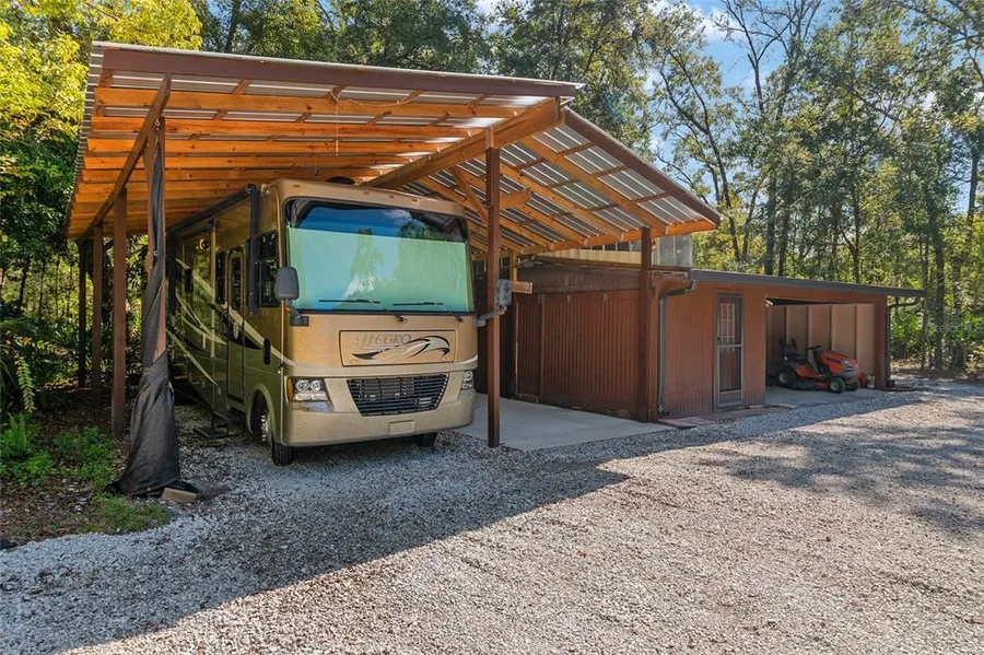 Discover your peaceful sanctuary in this meticulously maintained 3 bedroom 2 bathroom home nestled on 6 completely fenced acres of a beautiful mix of cleared land and natural woodland. Upon entry into the residence from the expansive deck, you will be overwhelmed with the abundance of warmth and comfort stemming from the newer luxury vinal plank floor carefully laid throughout the home with the only carpet being smartly located in the massive bedroom closets. Natural light flows guiding you to the chef's dream kitchen boosting tons of cabinet and countertop space along with newer stainless-steel appliances. The intelligent floor plan joins the large dining room to the sprawling living room area creating an enormous great room that will keep the whole family connected. All three bedrooms are good size with the split primary bedroom offering a walk-in closet, a dual sink vanity, and a separate step in shower. As nice as the home is, outside is where this property really shines. As you enter through the super convenient solar powered gate, you can take a right towards a massive RV/5th wheel cover offering 50 amp service, water, and a tie into the 3 year old septic system for storage or in-law/guest space. Heading straight up the driveway will open onto a gravel drive turn around that connects the home with an additional two covers large enough for a 35 foot RV and an additional fifth-wheel/tractor/lawnmower/boat. Attached to those covers is an enclosed office or storage room with power and another carport storage area for a grand total of 2 RV covers, 1 fifth wheel or boat cover, and 4 covered parking areas for vehicles. As if that was not enough, behind the carport is a covered workshop area and 2 large nearby sheds. In addition to the entire 6 acres being fenced, there is a smaller fenced in area off the screen patio perfect for smaller pets. Included are less than 2 year starting of apple trees/grapefruit/clementine trees and 2 metal garden planter beds for any gardening needs. Can't miss the 10,000 gallon above the ground pool to enjoy the Florida hot summer days and cool off. Pool also features a custom deck and privacy wall if the surrounding forest is not enough. Come let this property take your breath away.