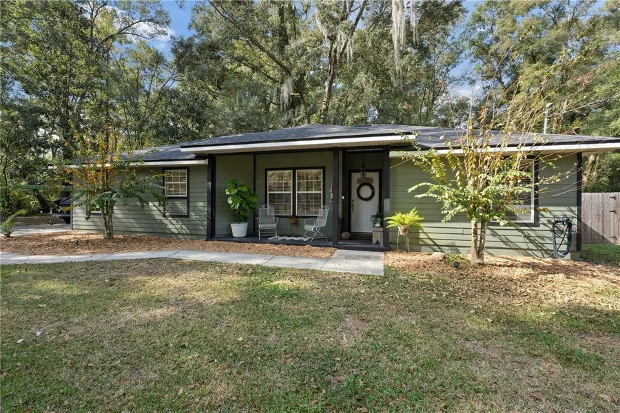 Absolutely charming 3/2 home recently updated with a spacious new kitchen, including new flooring, wood cabinets, and quartz countertops. This home features a new roof in 2024 and is located at the end of a cul-de-sac in the quiet community of Archer. The combined dining and living spaces with a cathedral ceiling are bright and open to a beautiful and completely fenced, spacious backyard just waiting for your family to enjoy. Store tools and gardening supplies along with outdoor games in the conveniently located 10 by 15 shed. The covered entry to the shed provides even more storage for bikes, a planting station and a grill. Reenter the home through the sliding glass doors to the living area or a surprise entry door into a flex room off the primary suite. The finished flex room with new flooring, providing even more storage, would also be perfect for a home office or even a nursery...