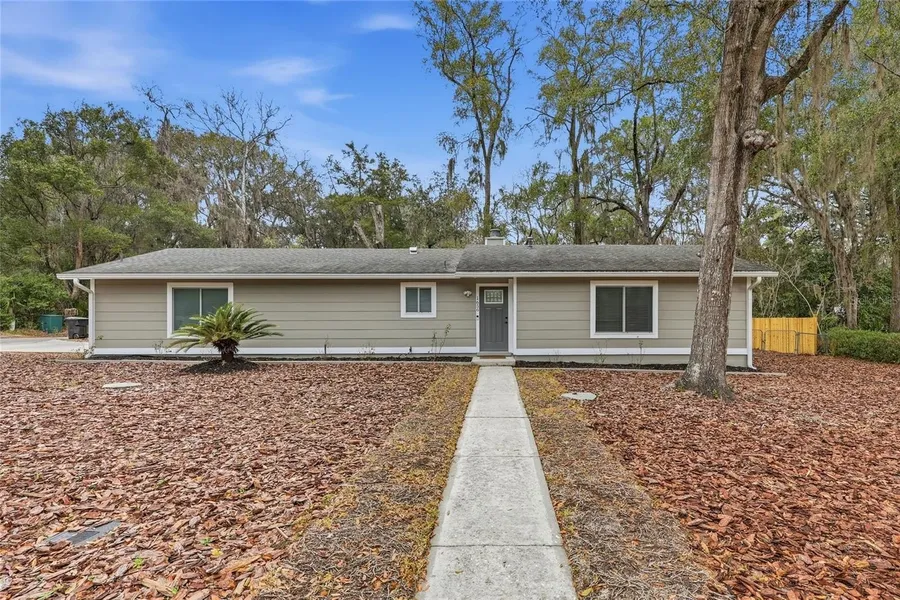Welcome home to this charming turn-key 3 bedroom / 2 bathroom property in prime NW Gainesville location. This home has been completely renovated with luxury vinyl plank flooring throughout, walls, baseboards, kitchen, baths, paint interior and exterior, recessed lighting, interior and exterior doors plus hardware, windows, French doors, HVAC 2024, Tankless Gas Hot Water Heater, overhead garage door, fencing and so much more. This home is light and bright offering an open concept with seamless transitions to all main living areas. The kitchen is showcased with granite countertops, new cabinets, stainless steel appliances, plenty of storage for all your culinary needs and designated dining area. The great room is highlighted with a vaulted ceiling, wood burning fireplace surrounded by brick and built-ins and French doors overlooking the expansive backyard. Stepping into the primary bedroom with walk-in closet and en-suite bathroom with walk-in shower surround large vanity with granite countertop and window. Second bedroom is robust in size with built-in closet. Second full bathroom features tub/shower combo and vanity with granite countertop. The third bedroom makes for a great flex space, office, den or nursery with direct access to primary en-suite bathroom. Laundry room with washer/dryer and additional storage space. 2 car garage enhanced by epoxy flooring and service door to backyard. Large backyard, fully fenced offering tons of privacy. NO HOA! Conveniently located minutes away from UF, Shands, grocery, dining and entertainment.