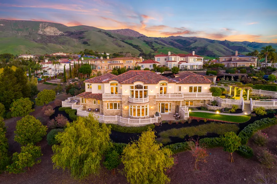 Let the opulence of this 7,440 square foot enclave leave you breathless with its endless panoramic bay views. Luxury abounds in a palatial primary suite with serene views, movie theater, radiant heated floors, and more. Soaring ceilings throughout and rich finishes inspire grand entertainment gatherings in formal living, dining, and family rooms. Gourmet kitchen offers gracious custom cut granite island, top of the line stainless appliances, and a palatial walk-in pantry. Primary bathroom features marble finishes and spacious double vanity. Movie theatre with HD projector and black and white audio are just some of the fine entertainment features of this estate. Library outfitted with abundant custom cabinetry, crown molding, and surround sound. Lutron Homework automation system, motorized window shades, wrought iron staircase, high velocity HVAC, travertine stairs/niches, accent lighting, and multiple balconies/terraces with spectacular views. Four car garage. 7.7 kilowatts of solar power make this home energy efficient.