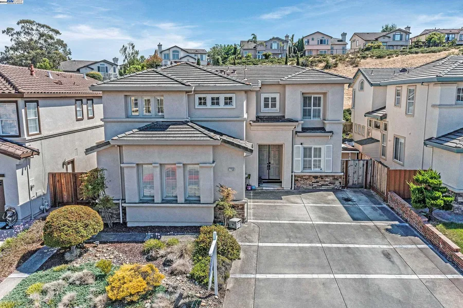 Experience the charm of suburban living with this expansive home nestled in the serene cul-de-sac of Palomares Hills in Castro Valley. Featuring soaring ceilings that grace the living and formal dining rooms, this residence promises an atmosphere of airy elegance. Central to the home, a cozy kitchen equipped with a gas cooktop, double oven, and breakfast bar adjoins a welcoming living area, anchored by a warming fireplace beside the eat-in kitchen space. Plantation shutters enhance every room, adding a touch of sophistication. This well-designed floor plan includes two bedrooms and a full bathroom on the main level, perfect for guests or office space. Ascend to the second floor to discover two additional bedrooms, a convenient laundry room, and a luxurious primary suite. The suite boasts a large, inviting space with a bathroom featuring double sinks, a sunken tub, a stall shower, and wal...