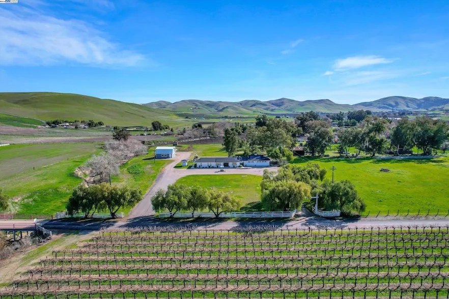 Nestled among picturesque rolling vineyards, this stunning 5-acre farmhouse property beautifully combines charming farmhouse aesthetics with modern elegance. Enclosed by a classic white picket fence, it provides a peaceful retreat just a short drive from Downtown Livermore. Step through grand double doors and let sunlight fill the space through expansive sliding glass doors, revealing breathtaking views of Livermore s hills. The heart of the home is an updated farmhouse kitchen featuring elegant quartzite countertops, a spacious peninsula, and a classic deep farmhouse sink. The thoughtful layout includes a serene primary suite as a retreat, with additional bedrooms placed on the opposite side for privacy. Luxurious updated bathrooms with double vanities add to the charm. The 3-car garage features a flex room, perfect for an office, gym, or art studio whatever your heart desires! Outdoors, enjoy weekends on your own dirt bike track, honing your skills on the mound, or testing your aim at the axe-throwing station. A charming two-story barn offers ample storage, and a delightful play structure provides endless fun for little ones. With owned solar and a private well, this home is not just beautiful; it's efficient, too perfect for embracing a vibrant lifestyle.