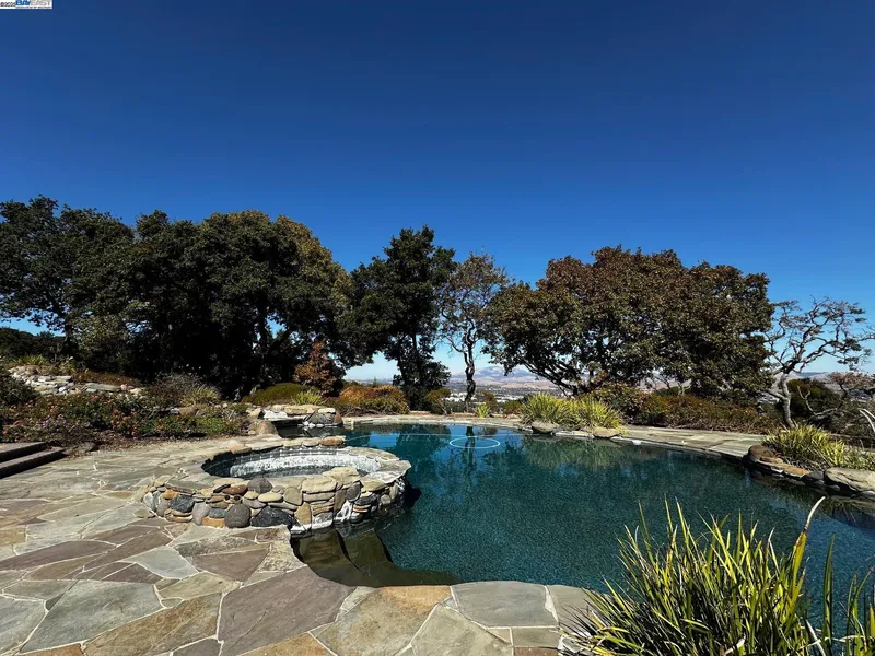 Nestled in the scenic Pleasanton Ridge, this 77.48-acre estate offers unmatched luxury and privacy. Built in 2000, the custom home spans 8,590 square feet with a single-level layout featuring seven bedrooms, six full baths, and two half baths. The gourmet kitchen is equipped with high-end appliances, stone countertops, and a breakfast bar, ideal for both everyday meals and entertaining. The adjacent family room boasts a cozy gas fireplace and large windows framing stunning views of Mt. Diablo and the valley. The expansive primary suite includes a spa-like bathroom with a jetted tub, stall shower, and skylight, plus a private retreat for quiet moments or a home office. A laundry room completes the main level. A highlight of this estate is the 10-car, museum-quality garage with heating, air conditioning, checkered flooring, and central vacuum. With 4 additional car garages provide extra storage and convenience. Outside, the landscaped grounds feature a swimming pool, a spacious deck, and a patio perfect for alfresco dining, all with panoramic views of the valley. This exceptional estate offers the ultimate in luxury, comfort, and natural beauty. Located in a top-rated school district, it provides excellent education for your children while offering a serene, outdoor lifestyle.