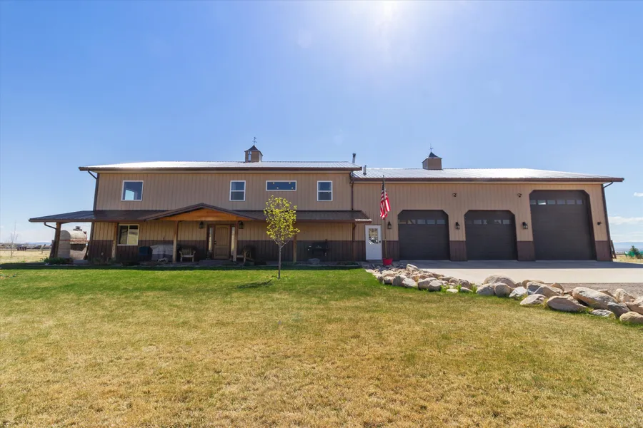 A remarkable barndominium-style residence offering the perfect blend of rustic character and modern comfort. Built in 2017 and set on 3.75 acres just minutes from the comforts of Laramie, this thoughtfully designed property features a spacious 4,000 sqft home paired with a 3,340 sqft garage and shop space. Inside, custom craftsmanship shines with soaring ceilings, a stunning stone fireplace hand-stacked from real, quarried stone sourced in Minnesota, and a banister styled after a wildlife-friendly fence, crafted from reclaimed wood salvaged from the Mullen Fire. The gourmet kitchen is equally impressive, featuring granite countertops, black stainless-steel appliances, a generous walk-in pantry, beautiful reclaimed barnwood accents and a wet bar.